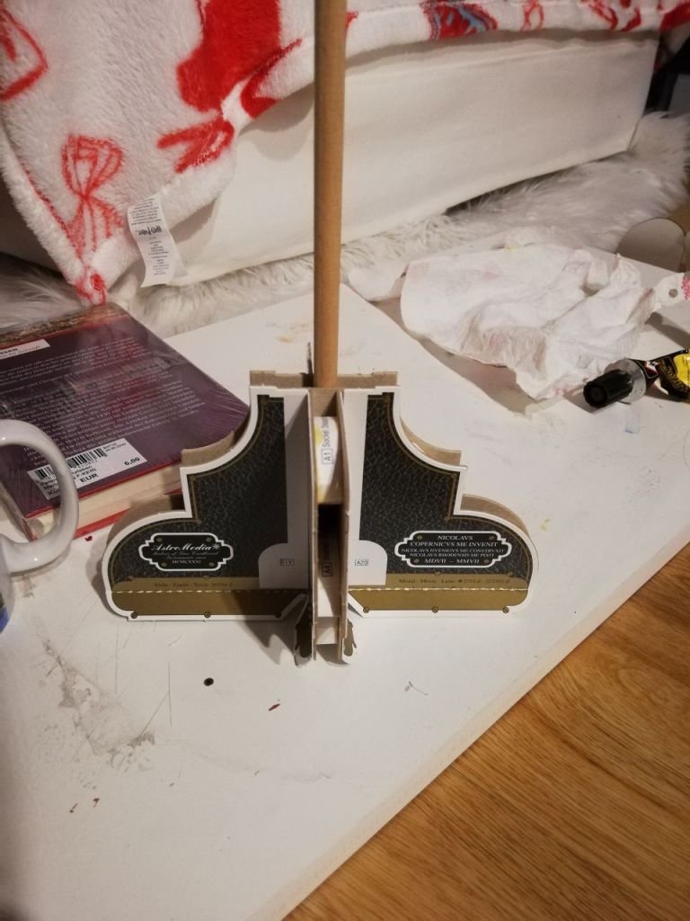 Now here is what you need to be aware of: You need to create EVERYTHING by yourself. If you take a look at the crank for example: The disks around it, you punch out the cardboard and the printed paper and glue the paper on both sides of the disk. And that process for ALL disks. And the crank itself, you take a long strip of paper and roll it up until it is a 3D cylindrical object and no longer a flat strip of paper. On the following WIP pic, you can also see that for the base, you have to glue in these white circles in between the walls as spaceholder. These circles, you also have to form them out of a strip of paper (many many times) and then glue between the cardboards. And then cover the cardboards with paper! You also need to paint the planets yourself, but that’s fun.