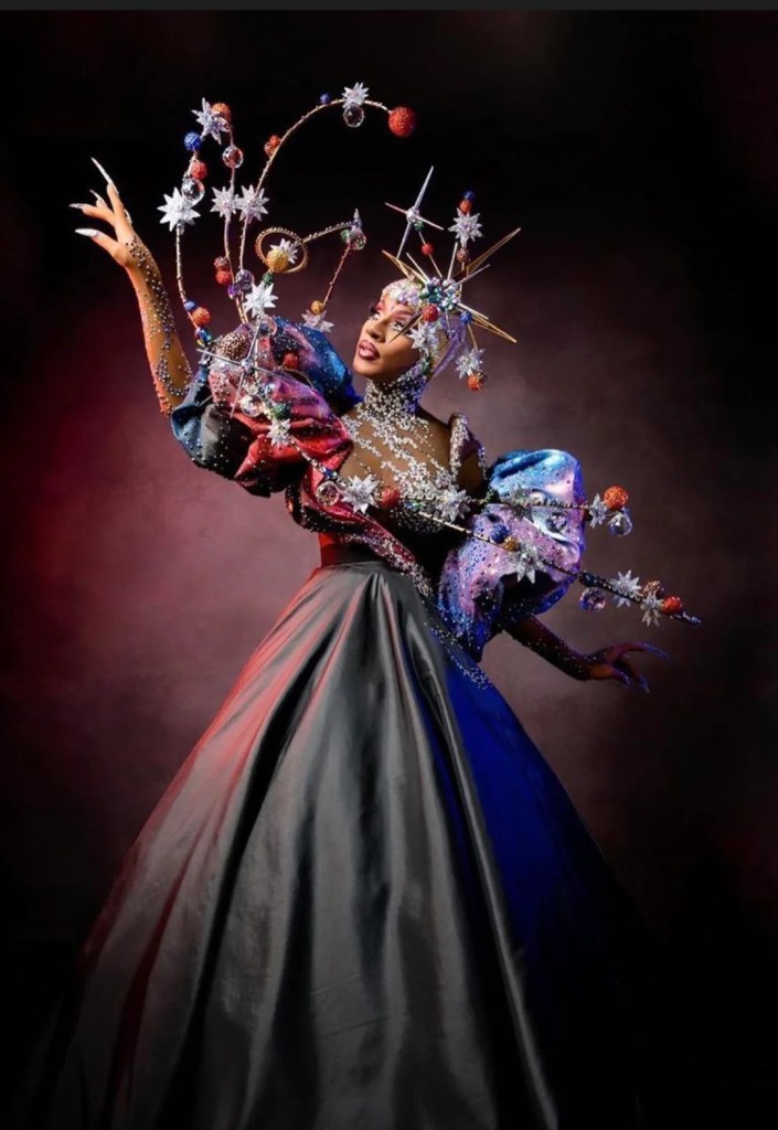 The Essence of Beauty has been enthrusting the viewers all season long. Her galaxy-inspired Grand Finale outfit – despite it being shown via Zoom – was a truly jawdropping masterpiece to lead up to her crowning. The outfit featured a deep, iridescent fabric that transitioned from dark nebula blues to twinkling starlit purples, capturing the essence of a night sky. Accentuated with celestial accessories and a stunning headpiece that resembled a halo of stars, Jaida’s look was a stellar masterpiece that truly shone in the Drag Race constellation. The designer behind his masterpiece was Joshuan Aponte who most viewers might recognize as he has been commissioned by a range of queens and brought many stunning pieces to the runway. The artist posted a BTS timelapse of the construction, from sketching to constructing the wires and stoning, highly recommended to watch!