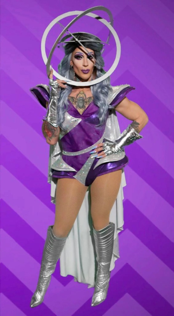The first challenge for the queens in España Season 1 was a design challenge, having to craft a high-fashion outfit with flea market items. Sagittaria delivered an incredible selfmade look, branding herself from the get-go. With a constellation as a moniker, she crafted a beautiful piece of art with a hoop skirt and planets surrounding her. The Instagram caption for her looks is “Next stop Dimension Sagittarius ♐️” and it definitely is worth going on a trip there.