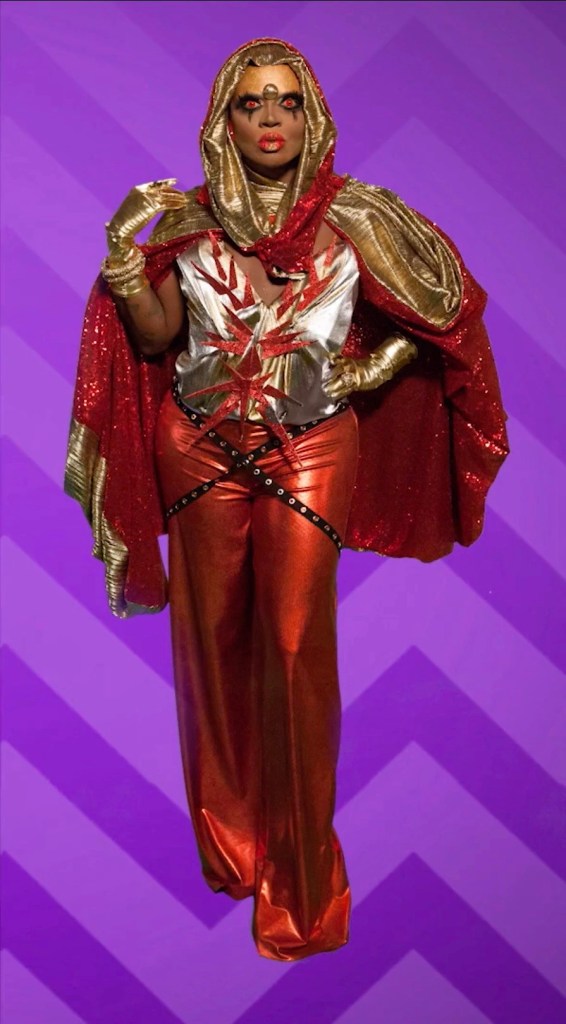 We will go full circle and end with another look from the Last Ball on Earth challenge. While in the show, Mayhem only received a safe placement, she will close this top 10 list with her red and gold outfit. Her ball outfit features both glamour and apocalyptic vibes. The outfit featured metallic accents, distressed textures, and bold embellishments. Mayhem’s makeup was also on point, with dramatic red lenses and black eyeliner, accentuating what she is now famous for – her big eyes that cause confusion!