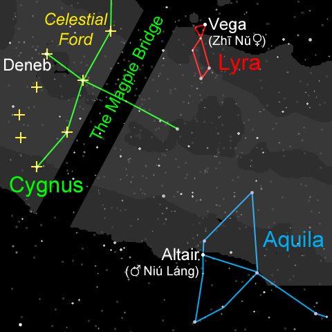 In Chinese mythology, these two stars are personified as Zhinu (織女; the weaver girl, symbolized by the star Vega) and Niulang (牛郎, symbolized by the star Altair). According to the legend, Niulang and Zhinu fell in love, but their union was forbidden and they got separated by being placed on opposite sides of the heavenly river (the Milky Way). Once a year, on the seventh day of the seventh lunar month (during the Qixi Festival), a bridge of magpies forms across the Milky Way, allowing the lovers to reunite for a single night. The stars Altair and Vega are really visibly separated by the Milky Way in the night sky, and the annual cycle of their visibility aligns with the timing of the festivals.