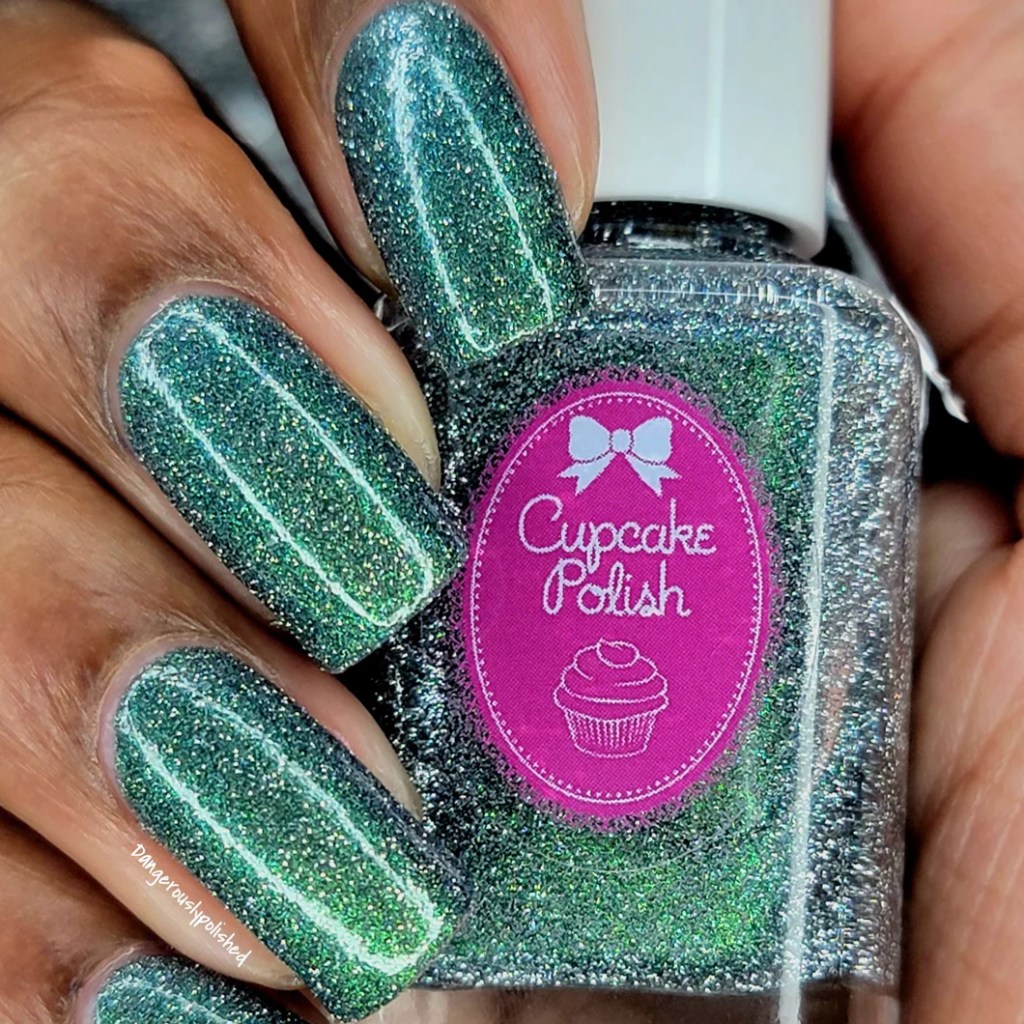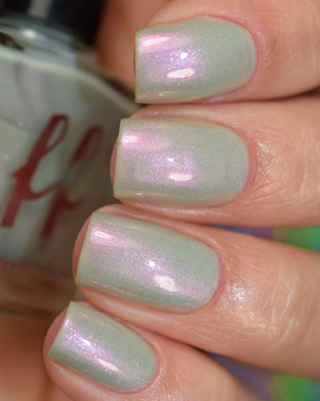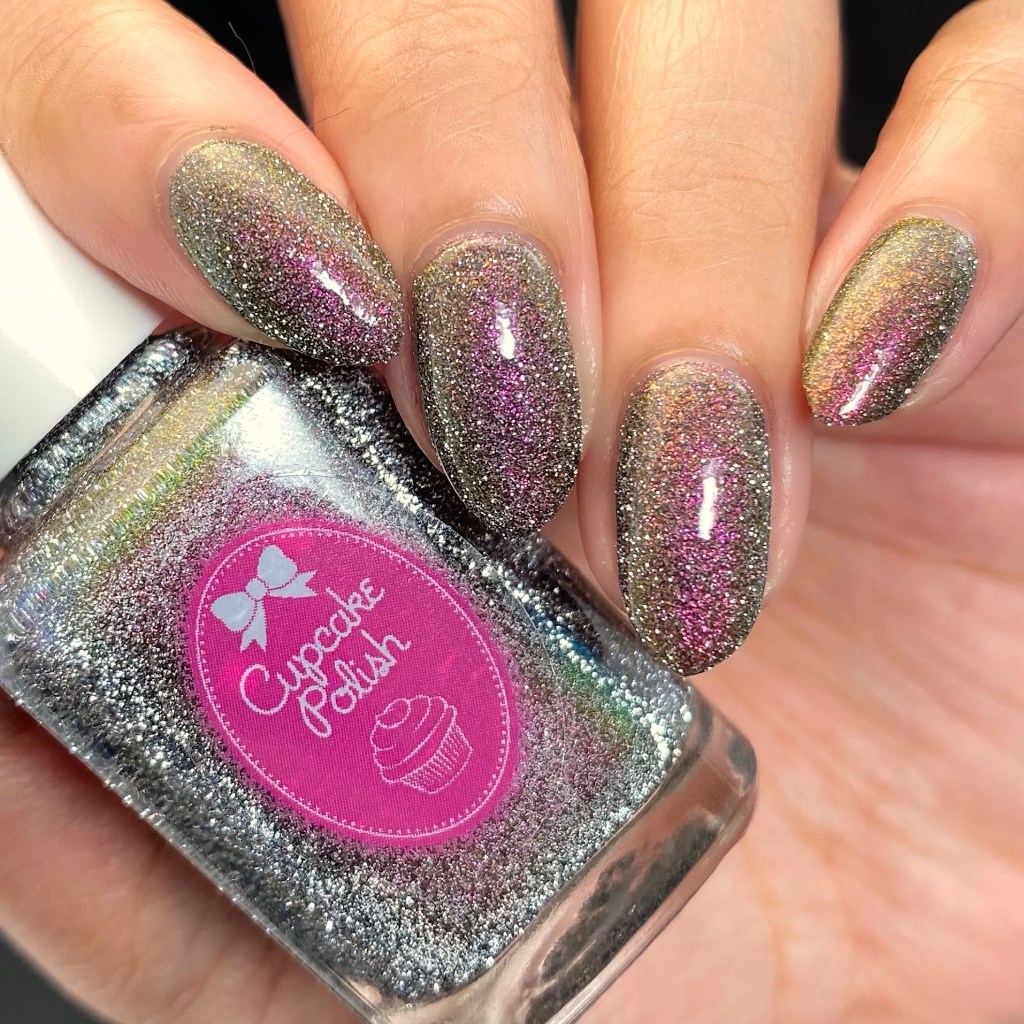 Source: Cupcake Polish. Gold/pink/green multichrome nail polish with silver reflective glitter.