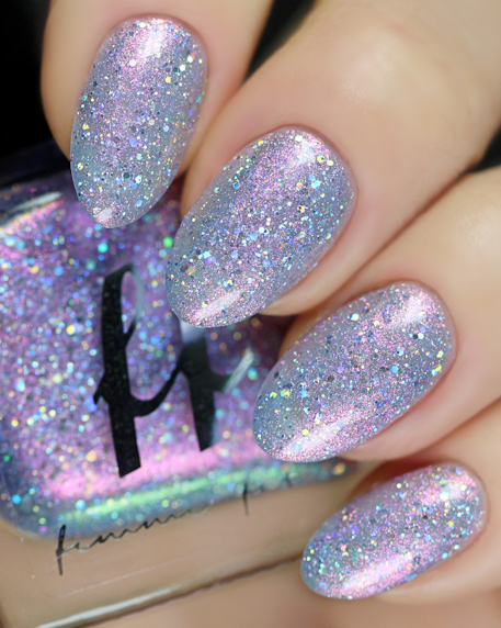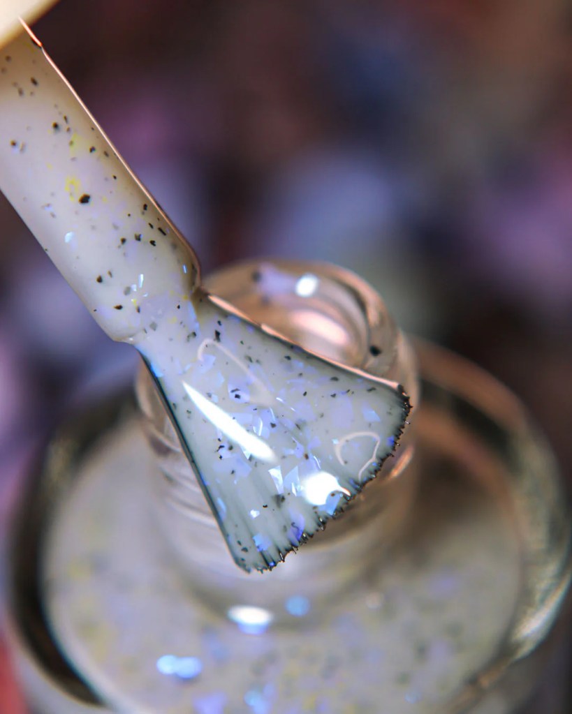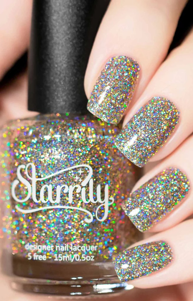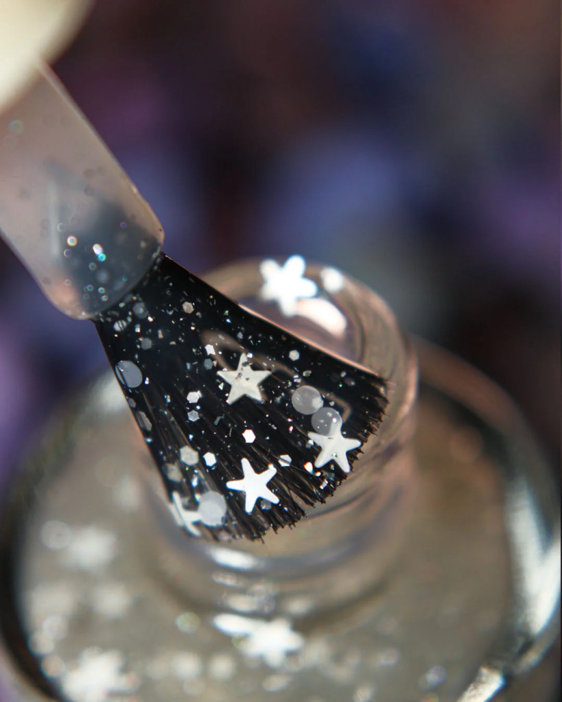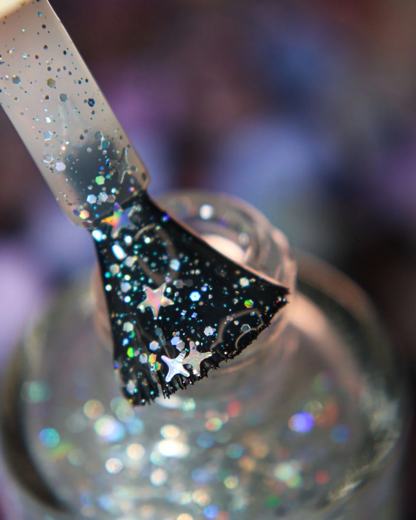 Source: Emily De Molly. A clear glitter topper filled with silver holographic glitters including stars and moons and assorted iridescent flakes.